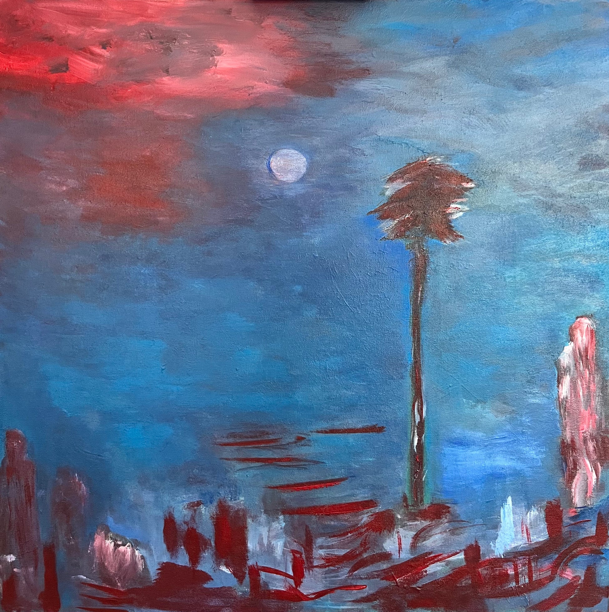 Coastal abstract landscape. Painted after the Los Angeles fires, January, 2025. Historical fire destruction of homes and southern California landscapes. Lonely burned palm tree standing tall and a woman looking up at the rising full moon in a dusky skies.
