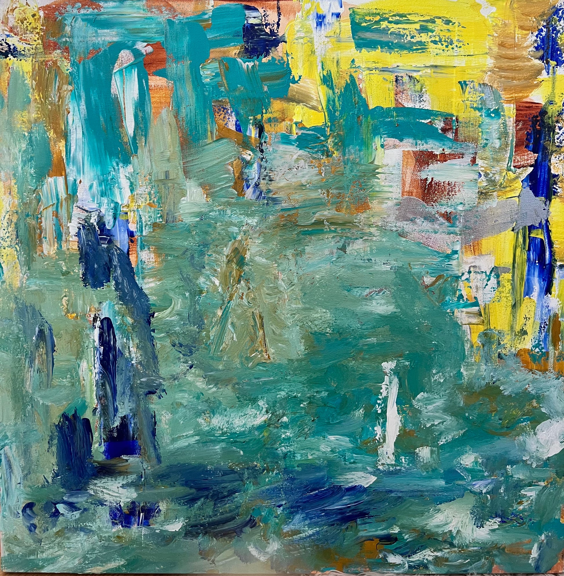 Create your own peaceful sanctuary with this frequency painting that inspires deep meditative experiences. Green, blue and yellow colors provide a healing calm atmosphere. Collectible original artwork.